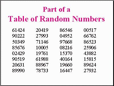 ![Part of a Table of Random Numbers [61424 90222 50349 85676 02429 90519 20631 89990 20149 27993 71146 10005 19761 61988 88967 78733 86546 04952 97668 08216 15370 40164 19660 16447 00517 66762 86253 25906 43882 15815 89624 27932]](https://researchbasics-education.media.uconn.edu/wp-content/uploads/sites/1215/2015/05/RANTBLE-400x300.jpg)