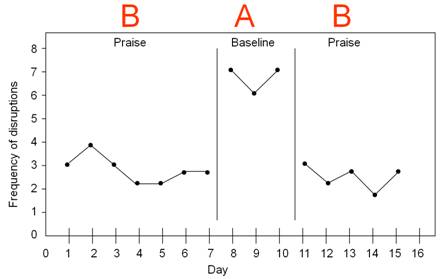 ![A graph with 'Frequency of distribution' from 0 to 8 in equal intervals for Ordinate and 'Day' from 0 to 16 in equal intervals for Abscissa; with 'Praise' at the top left of the graph, 'Baseline' at the top center, and 'Praise' [in red color] at top right; a vertical black line between Day 7 and Day 8 as a divider and a vertical red line between Day 10 and Day 11 as a divider; black dots at coordinates (3, 1), (2, 4), (3, 3), (4, 2.5), (5, 2.5), (6, 3), and (7, 3) with black lines joining all these points from (3, 1) to (7, 3) [in Praise section], black dots at coordinates (7, 8), (9, 6), and (10, 7) with black lines joining three dots [in Baseline section], and black dots at coordinates (11, 3), (12, 2), (13, 2.5), (14, 1.5), and (15, 2.5) with black lines joining all these points from (11, 3) to (15, 2.5) [in Praise section] with 'B' above first Praise section, 'A' above the Baseline section, and 'B' above second Praise section](https://researchbasics-education.media.uconn.edu/wp-content/uploads/sites/1215/2015/02/image010-400x251.jpg)